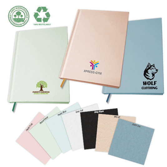 Available in 7 modern colours, 'The Eden' is 100% recyclable and 100% biodegradable, making it a great choice if your company is looking to be more environmentally friendly. Select your cover colour from: Pastel Pink, Pastel Green, Pastel Blue, Grey Fog, Deep Black, Biscuit, or Baltic Sea. Depending on the colour, your business branding can be printed full colour, digital print, or foil blocked. There is also an optional ribbon marker (non-recyclable) in a range of colours. Inside pages are white lined and insert pages can be added to the front or back of this product if you require. Please ask for a quote. This 96 sheet notebook features a stylish textured hardback cover and is casebound for a sophisticated finish.